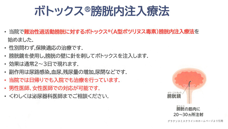 当院泌尿器科で難治性過活動膀胱に対するボトックス(A型ボツリヌス毒素)膀胱内注入療法を始めました
